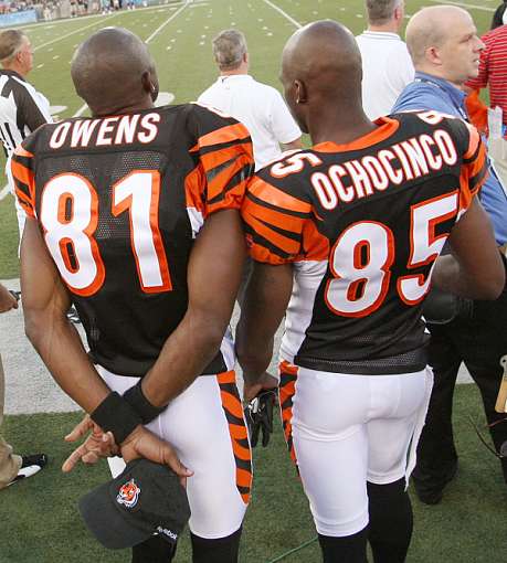 This to me seems to be the same situation in Cincinnati Bengals with Terrell Owens and Chad Ochocinco. Both players individually are manageable. Together, things will be fine if they are winning but if they are not, the team will implode. Terrell Owens is already a guy who likes to divide the locker room and take it public. Chad Ochocinco likes to talk and complain usually about his own plight but now with an enabler, I see him potentially starting to complain about everybody else.