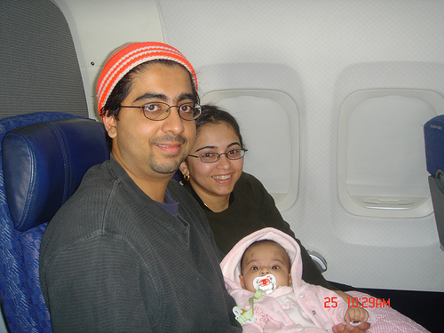 Hibah, Saif and Tannu at the plane     Christmas day was the day Hibah went on her first flight. She enjoyed the flight and did not cry at all. We flew from Austin to Detroit, Michigan.